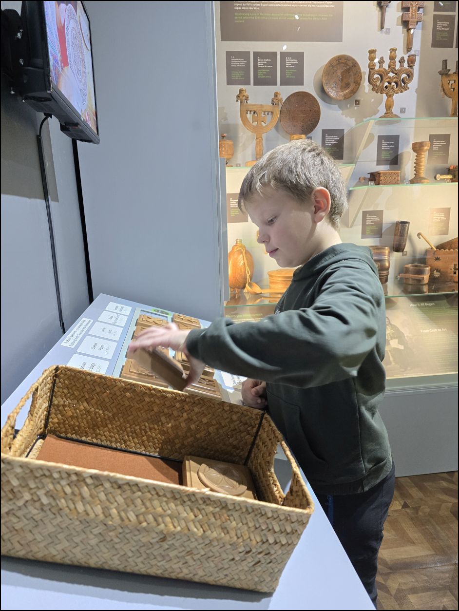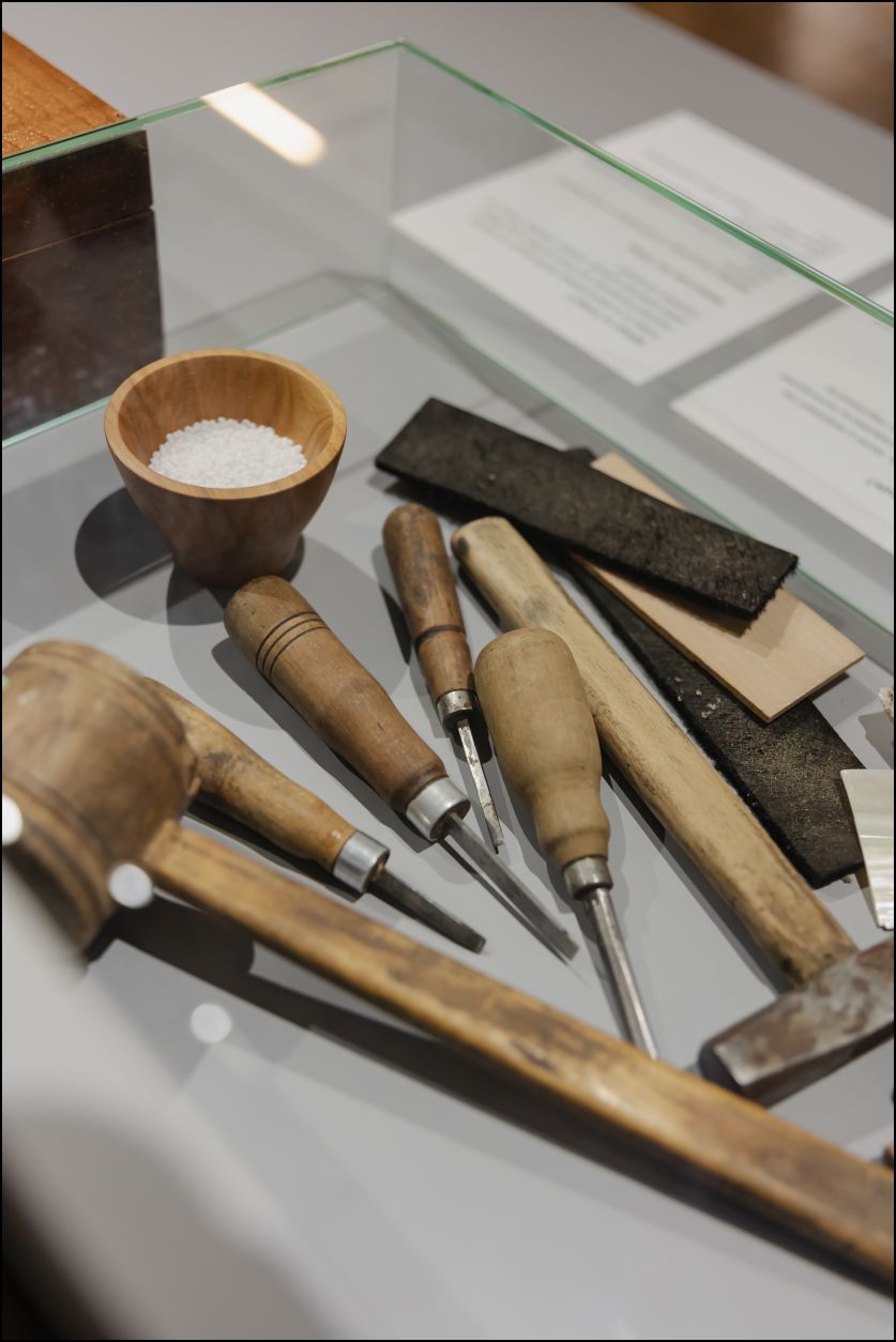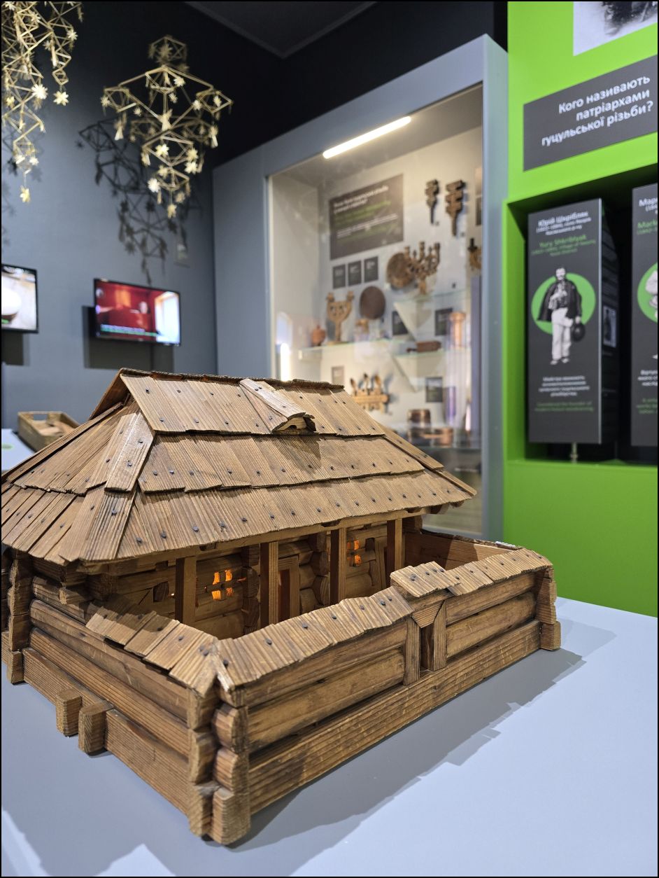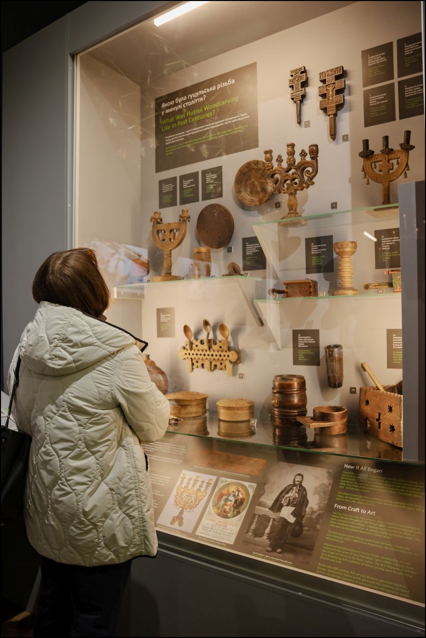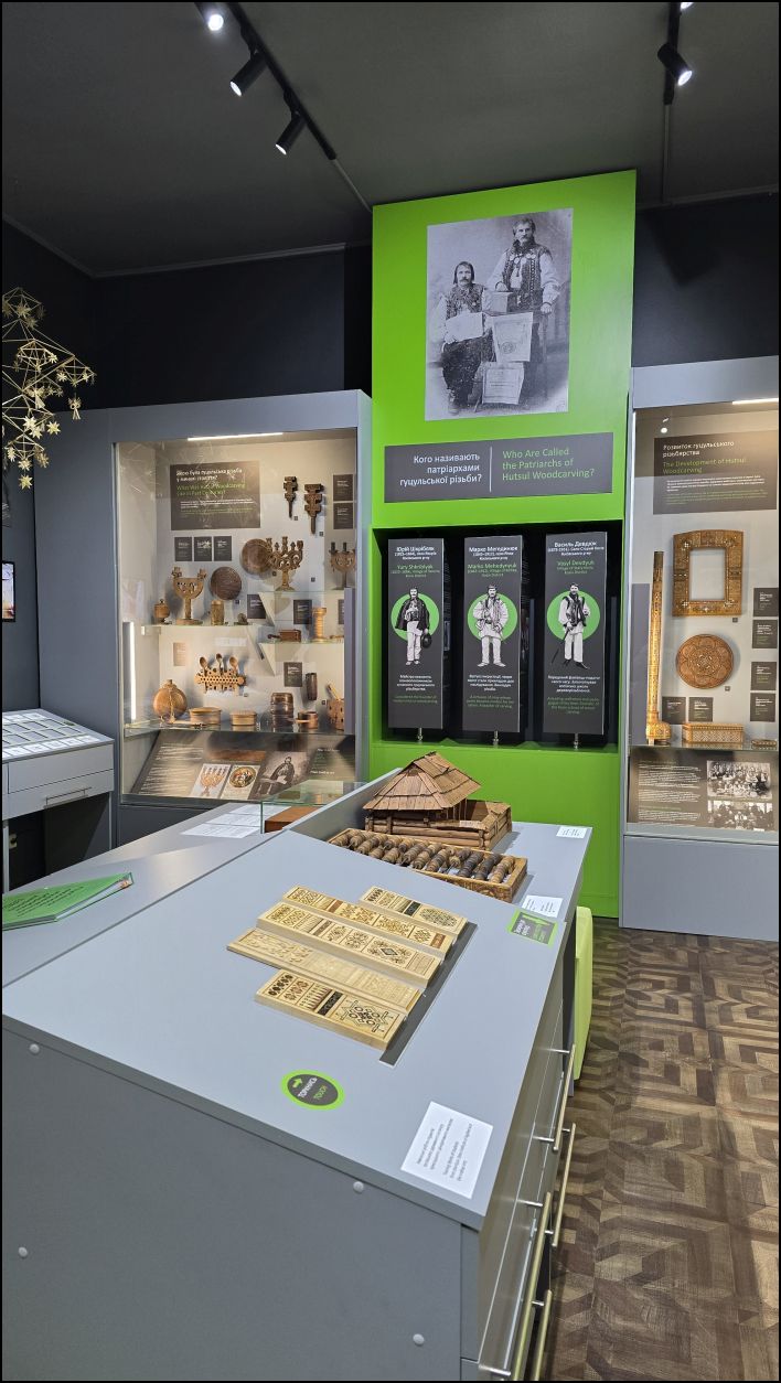Також тут можна познайомитися з історіями видатних митців через рухомі панелі з інфографікою та архівними світлинами, а сенсорний моноблок надає додаткову інформацію про художню обробку дерева.
