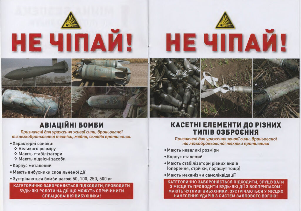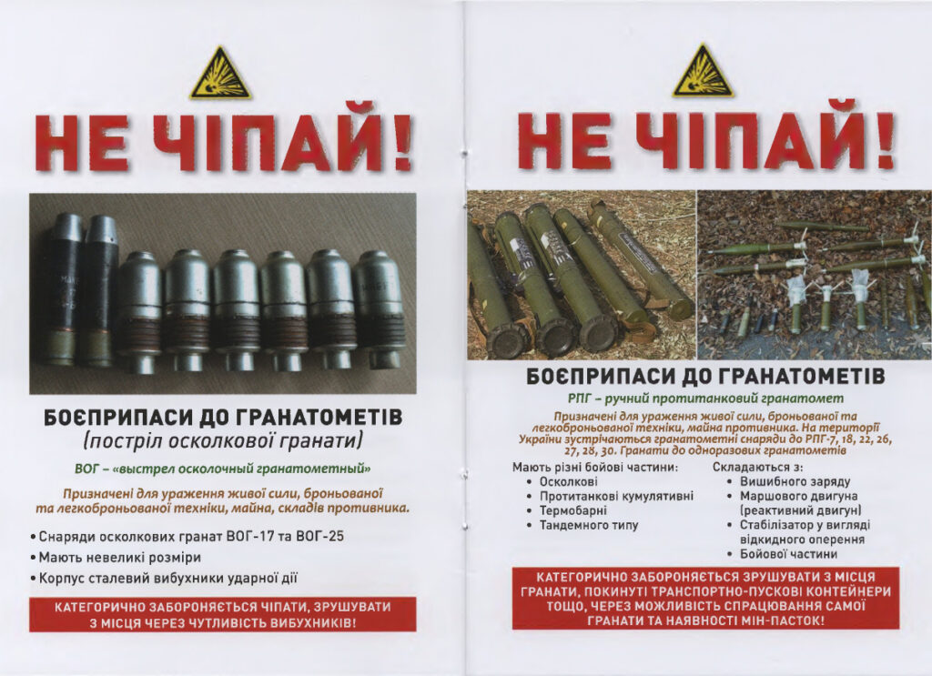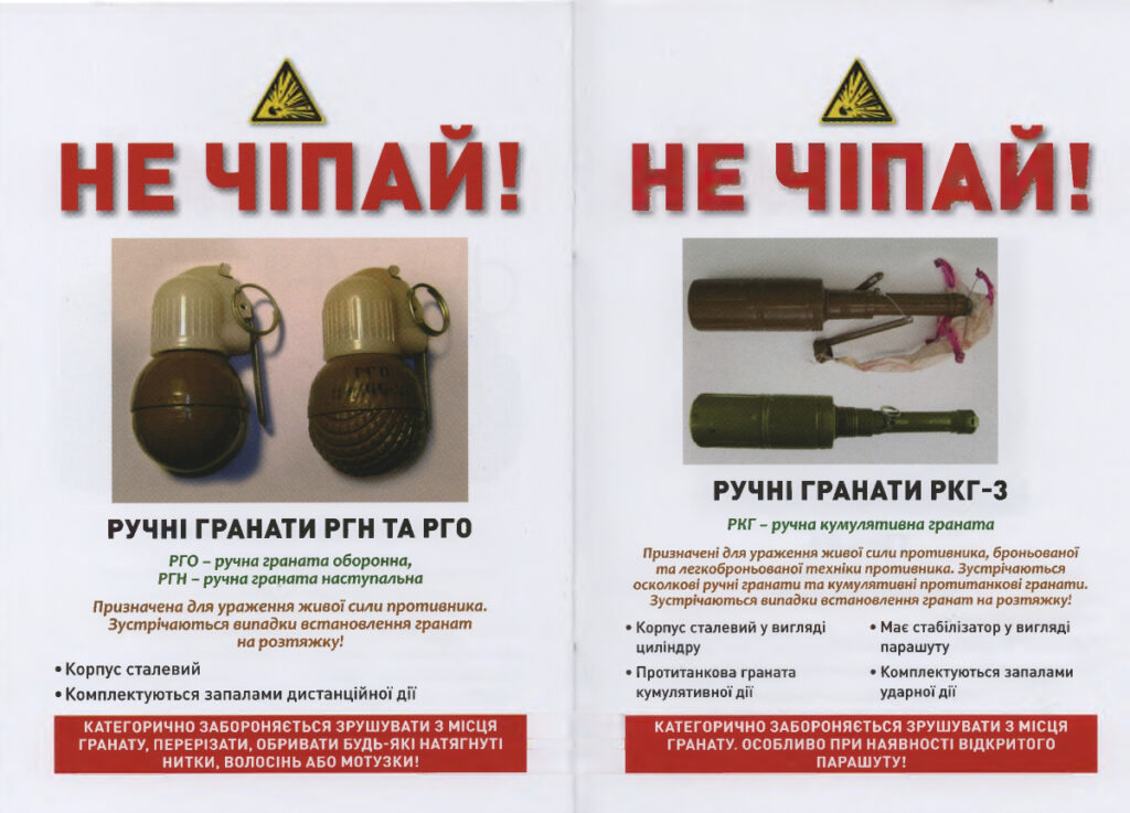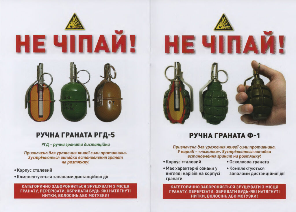 Надаємо перелік зображень вибухонебезпечних предметів, при виявленні яких заборонено: кидати їх у вогнище та нагрівати, вдаряти та розбивати, переносити або перекочувати, торкатися чи брати в руки, допускати скупчення людей біля них.