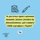 Чи достатньо одного щеплення вакциною Janssen (Jcovden) від Johnson&Johnson, щоб отримати COVID-сертифікат в Україні